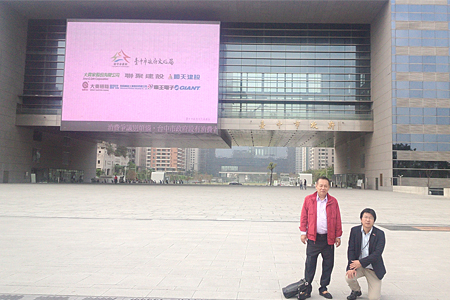 台中市政府を訪れた当協会の久積副会長(左)と佐々木青年部長(右)。入口正面には巨大なLEDビジョンが設置されており市民に行政活動やイベント告知などをおこなっています