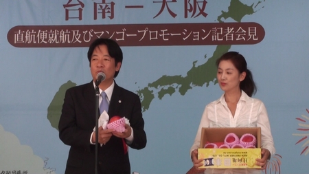 国内初となる台南-関西定期航空便就航記者会見に参加しました。  会場には多数の関係者・報道陣・ゲストが集い就航を祝しました。賴清德・台南市長が定期便就航会見と、マンゴーのプロモーションを行う姿に、当会も共に喜び祝しました。今後この定期便が日本と台湾の友好関係を深め、さらなる日台親善に拍車をかけることは間違いないでしょう。